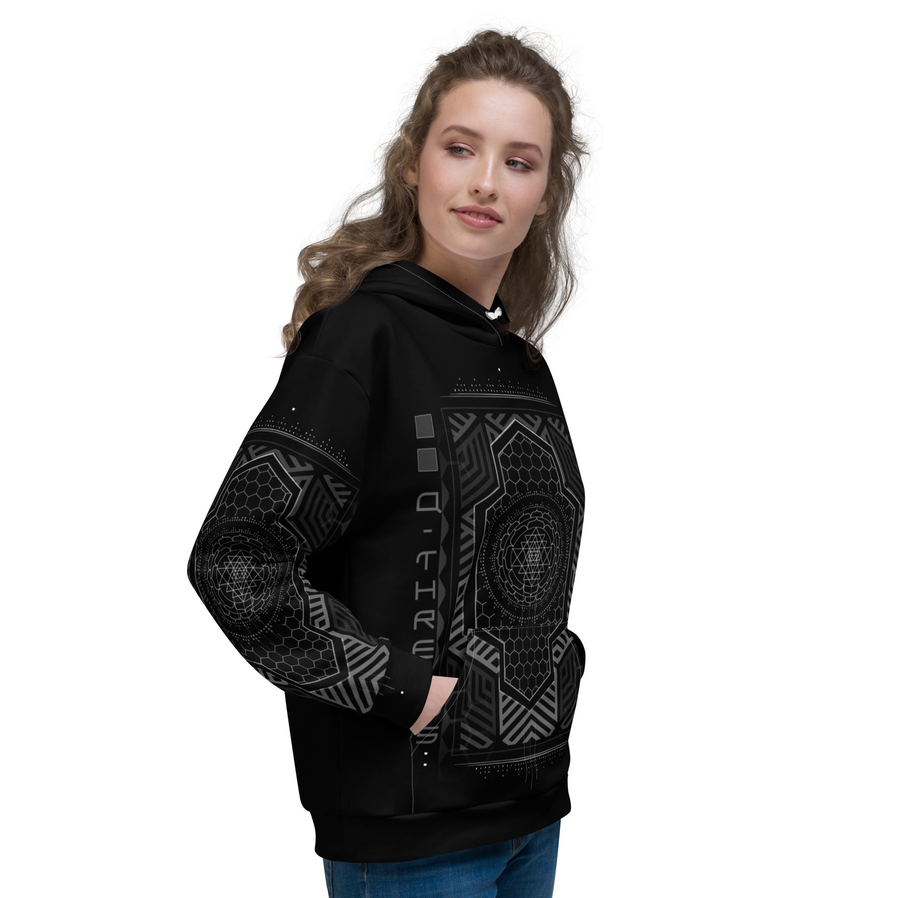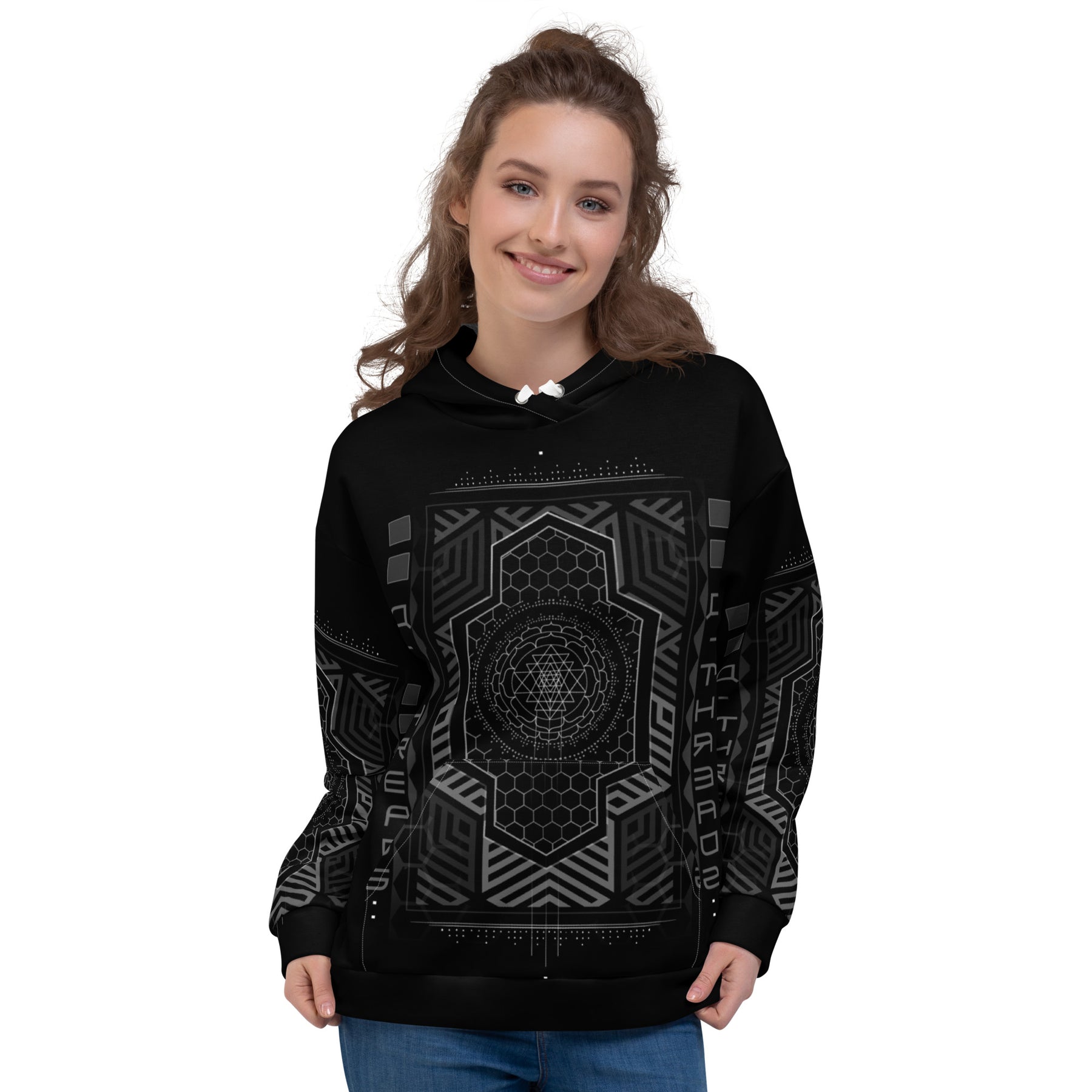 Step into sacred alignment with the Sri Yantra hoodie from Q Threads. Adorned with the timeless geometry of the Sri Yantra, this design radiates harmony, balance, and the infinite unfolding of consciousness. Each line and triangle is a map of the cosmos, a reminder that the universe is within you. Wearing it is more than comfort—it is a meditation in motion, a cloak of intention that carries the resonance of unity and spiritual awakening.