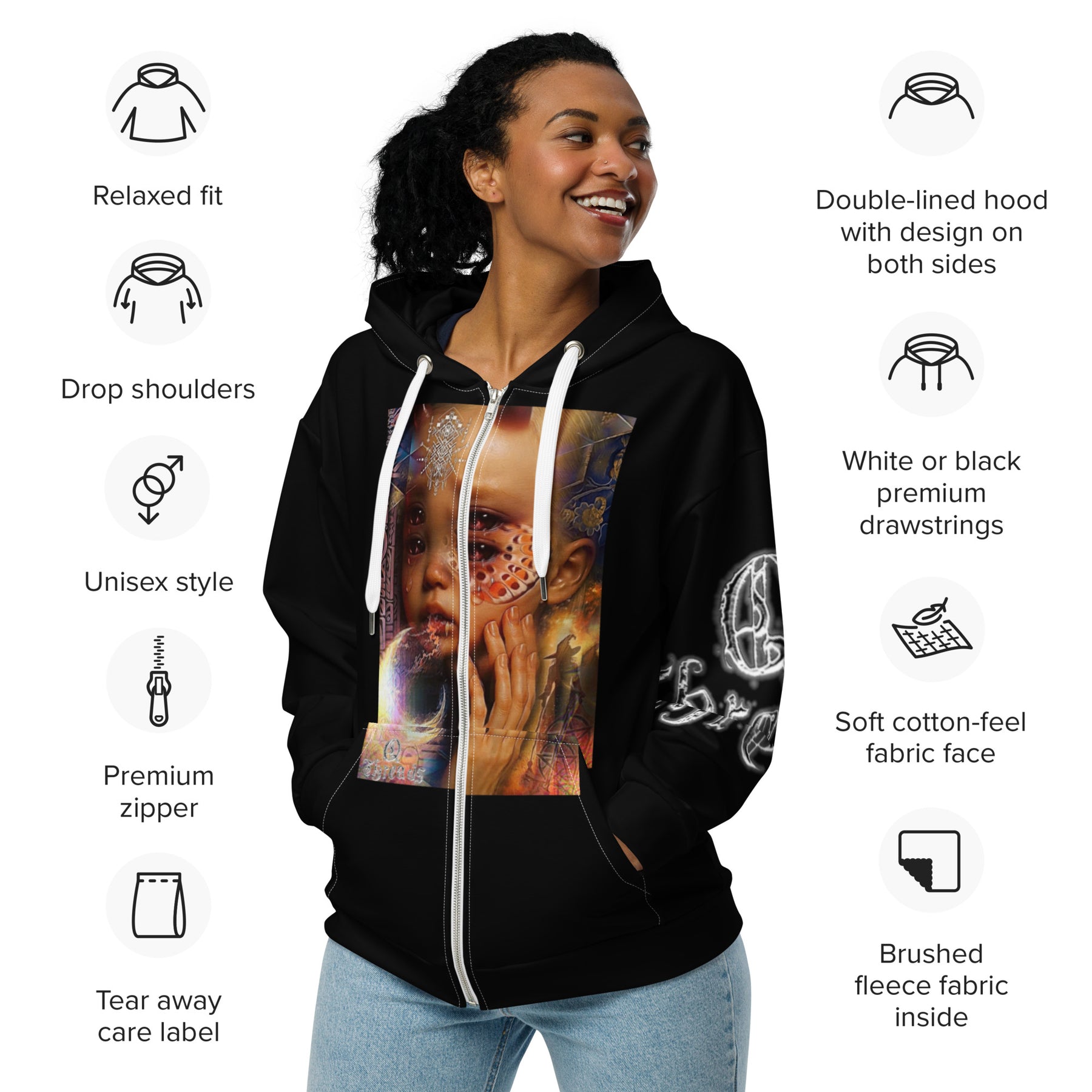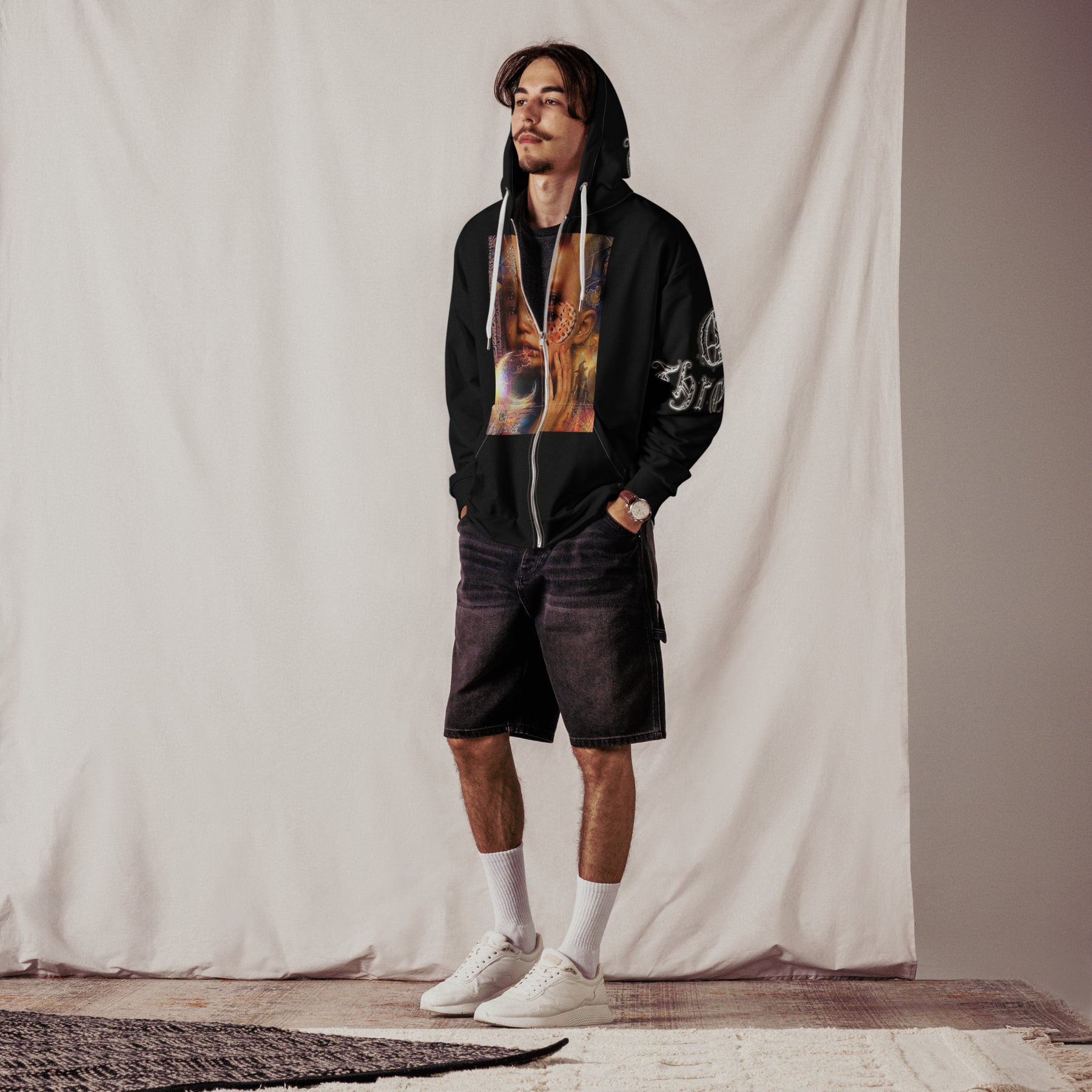 Crafted from 95% recycled polyester, this zip hoodie blends sustainability, comfort, and striking visual impact. The soft cotton-feel exterior and brushed fleece interior make it perfect for cool nights, while the high-definition sublimation print keeps Zack’s intense artwork sharp and vibrant. Designed with a relaxed unisex fit and premium finishing touches, this hoodie is made for those who like their style a little haunted—but always high quality.