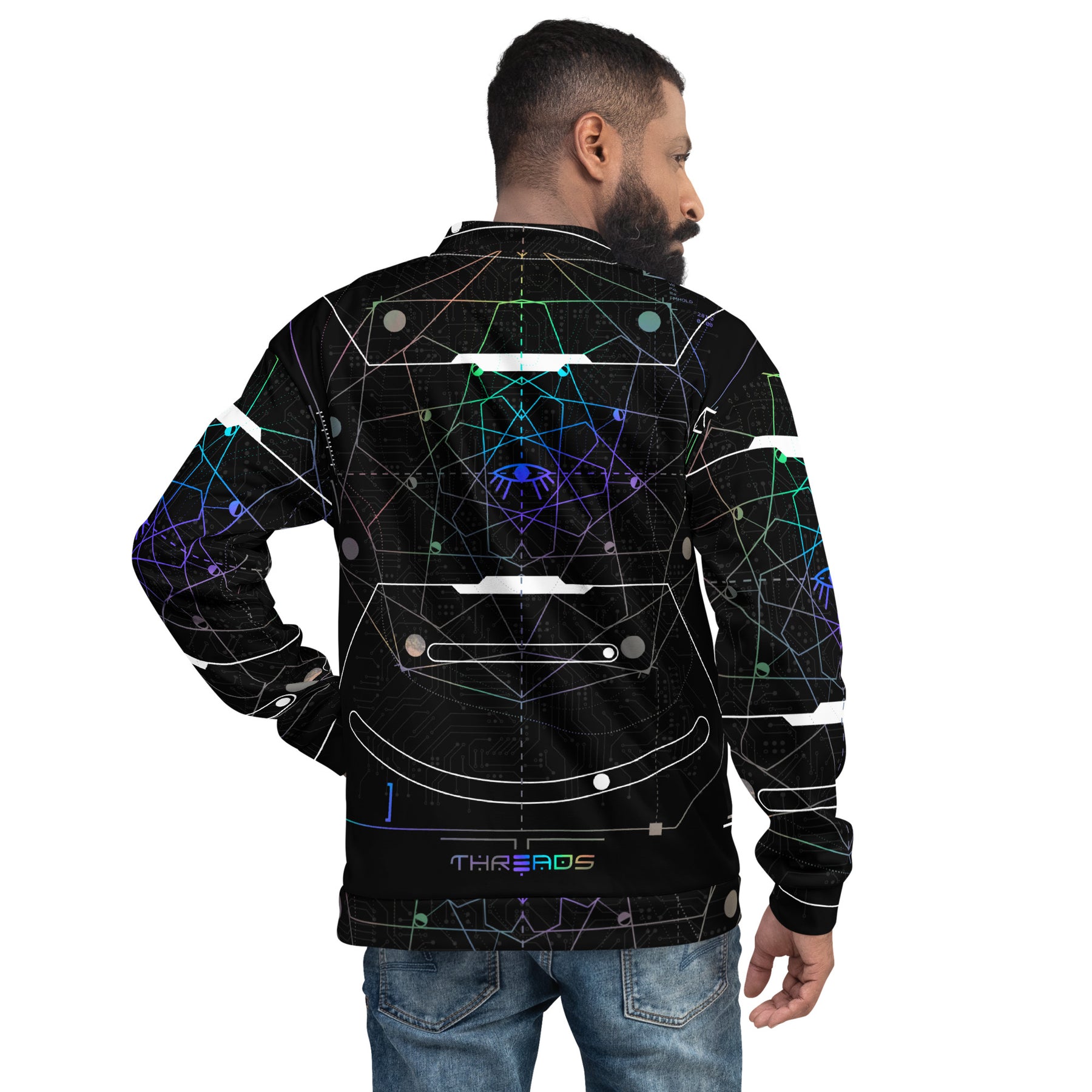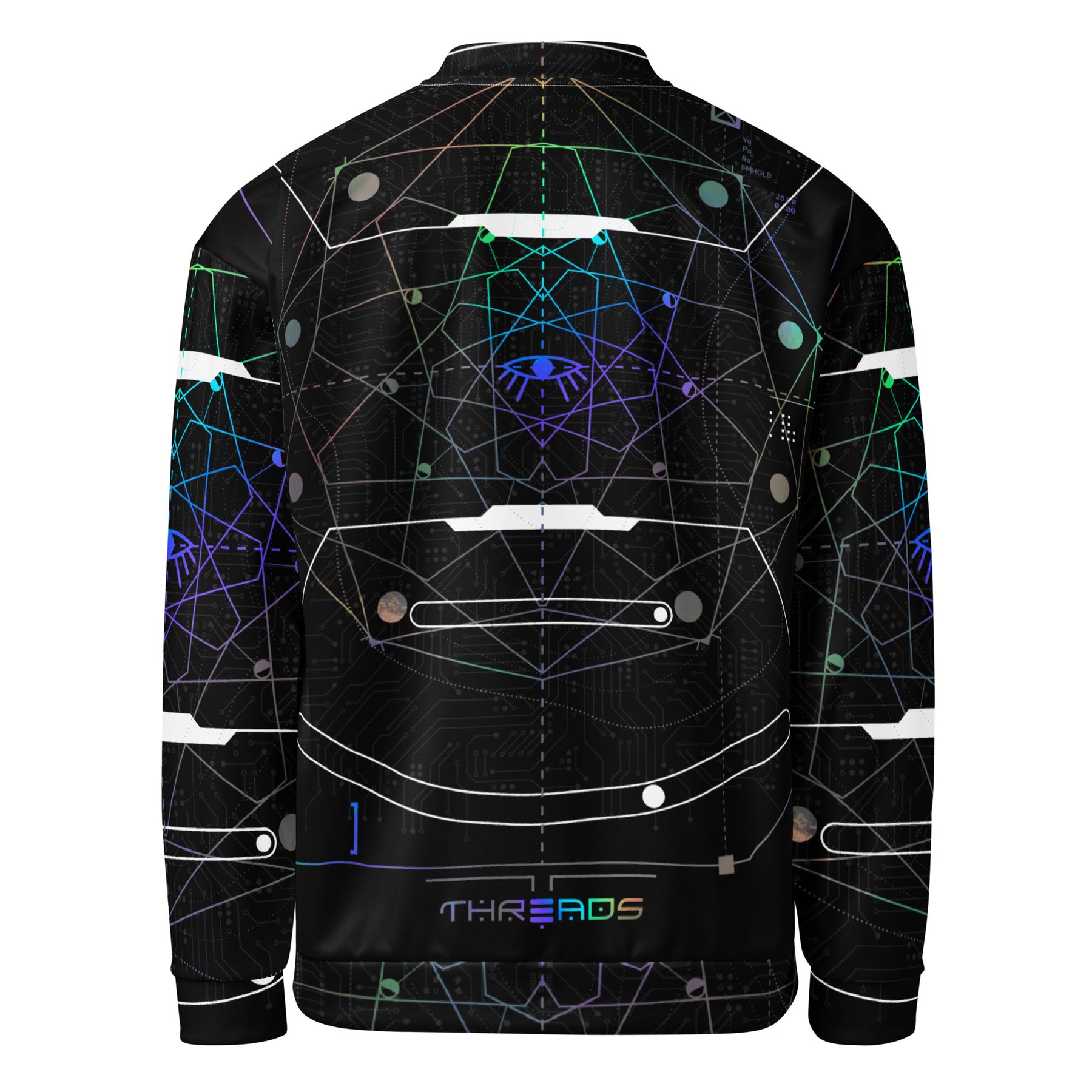 Step into the future of visionary fashion with the Rainbow Iris Bomber Jacket, a captivating piece of wearable art created in collaboration with digital artist Glass Crane, exclusively for the Q Threads line. This striking design centers around the mesmerizing image of an eye—an eternal symbol of vision, awareness, and perception—brought to life with a radiant spectrum of rainbow colors. The result is a bold, futuristic expression that transforms everyday wear into a statement of creativity and consciousness.