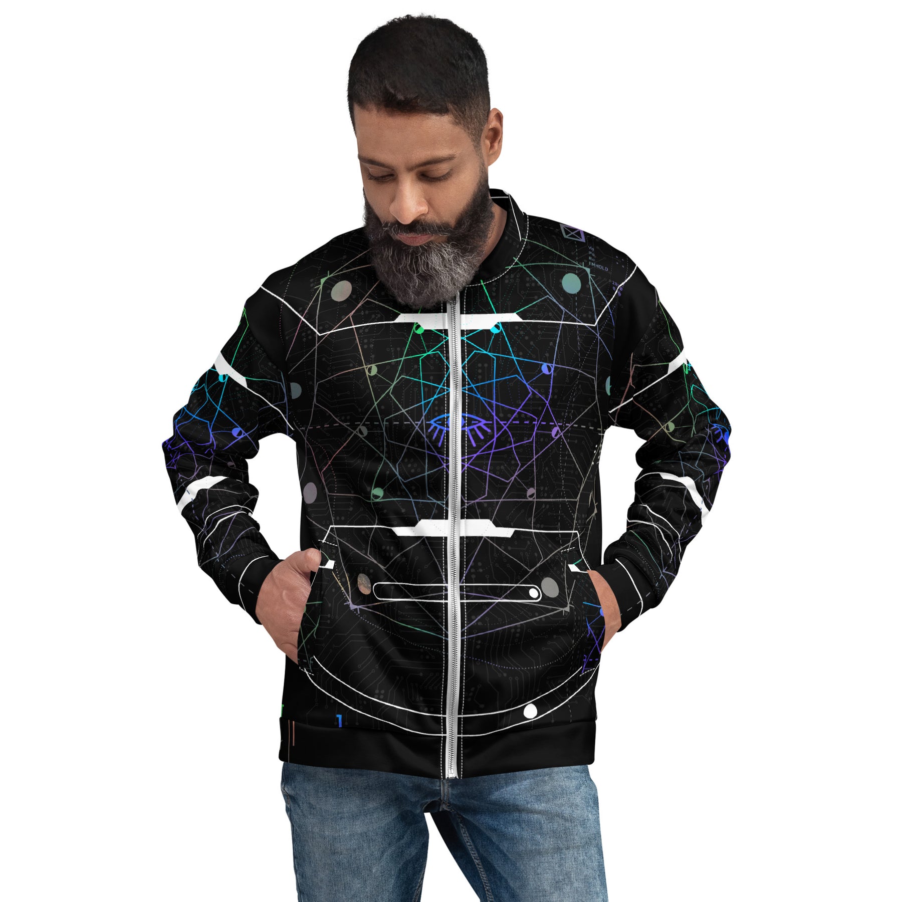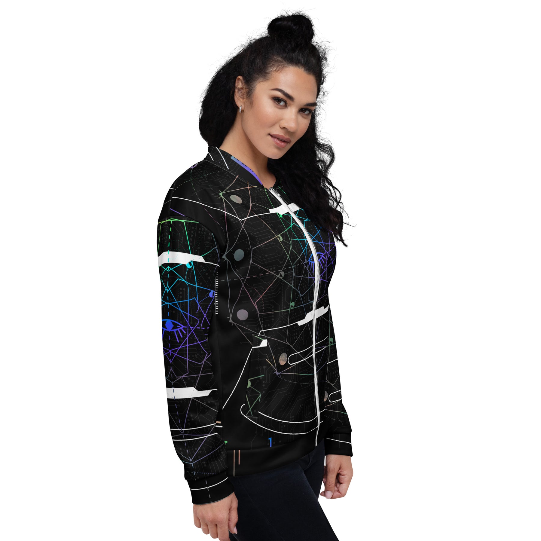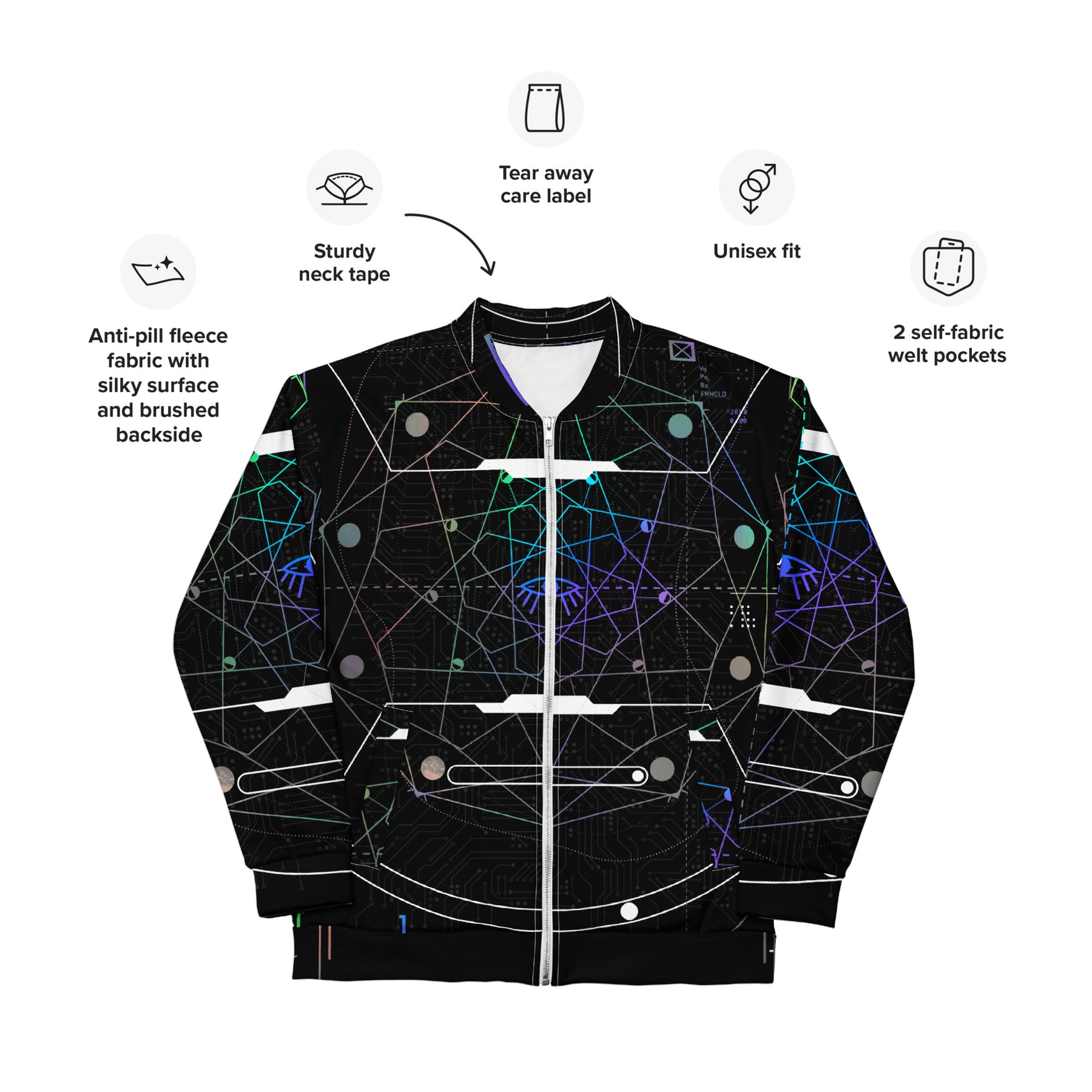 Crafted with precision using high-quality sublimation printing, the Rainbow Iris design wraps seamlessly across the jacket’s surface, ensuring vibrancy that won’t fade. A brushed fleece interior provides exceptional comfort, while the relaxed unisex fit makes it a versatile piece for layering. Whether you’re elevating your streetwear look or seeking a jacket that sparks conversation, the Rainbow Iris Bomber connects art, symbolism, and style in one visionary garment.